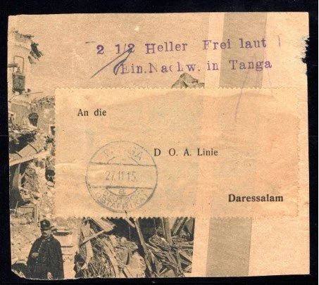 While Germany was able to supply GEA with regular shipments of stamps prior to the War, Allied blockades quickly isolated GEA from its’ mother country. By the end of 1915, there were no stamps at all of the denomination which paid the most needed letter and printed matter rates. In order to send mail around the colony, customers had to pay postage in cash at the post office. The two-line, purple hand stamp takes the place of the stamp that would otherwise have been put on this wrapper and shows that printed matter postage of 2 ½ heller was paid.